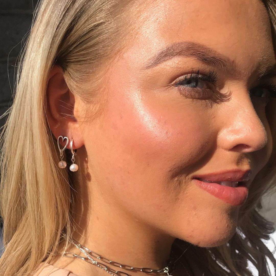 Silver plated tiny open heart stud earrings with dropping fresh water pearls.
