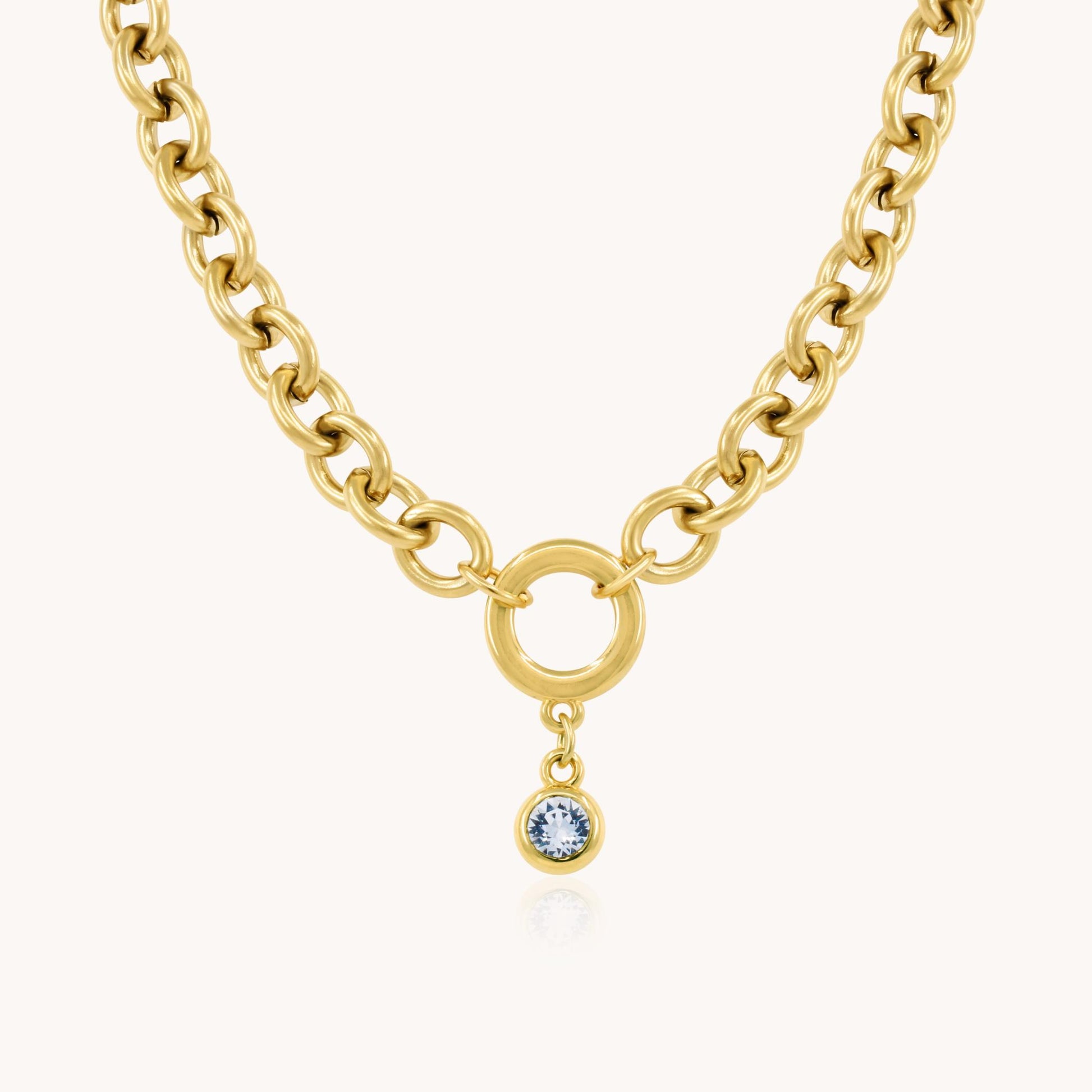 Make it personal with this bold yet meaningful piece. Crafted from gold-plated stainless steel, this chunky chain necklace features a sparkling birthstone charm – perfect for celebrating a birthday, milestone, or someone special.