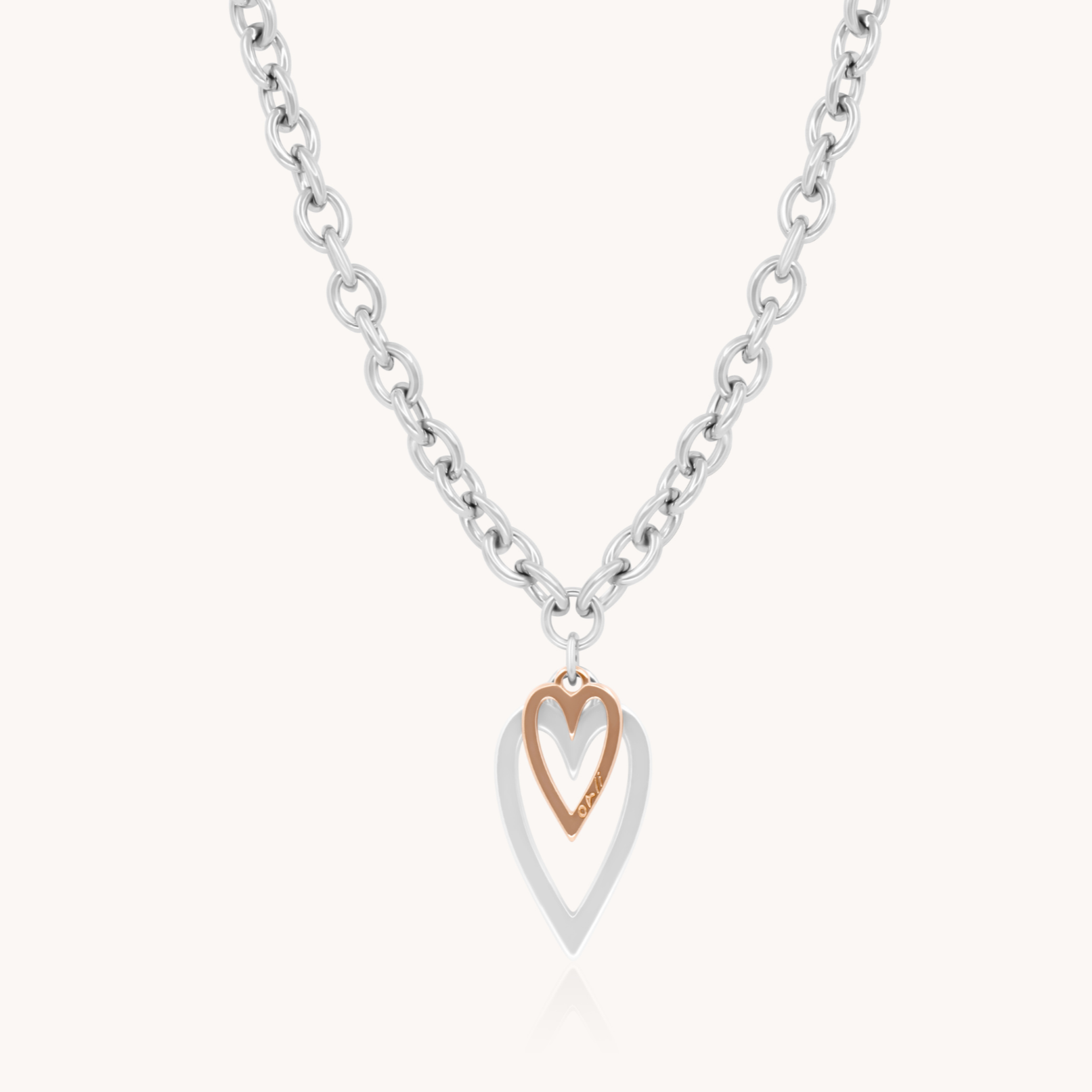 This necklace features two hearts that symbolise love, paired with a striking chunky chain. It’s the perfect piece to elevate your everyday look or make a statement for any occasion.
