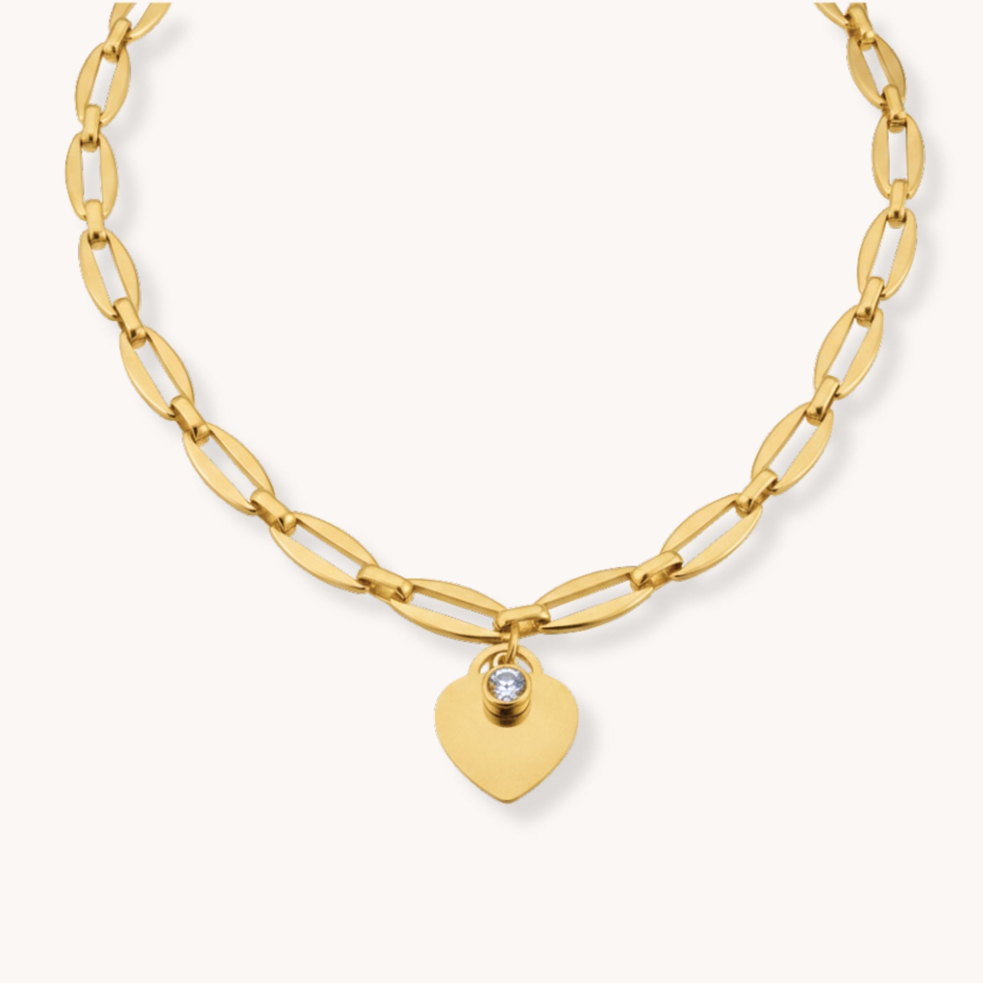 The Classic Heart & Birthstone Necklace in Gold is your everyday essential with a sparkling twist. Crafted from 18K gold plated stainless steel, it features a modern long-link chain with a heart charm and a custom birthstone — a meaningful blend of style and sentiment.