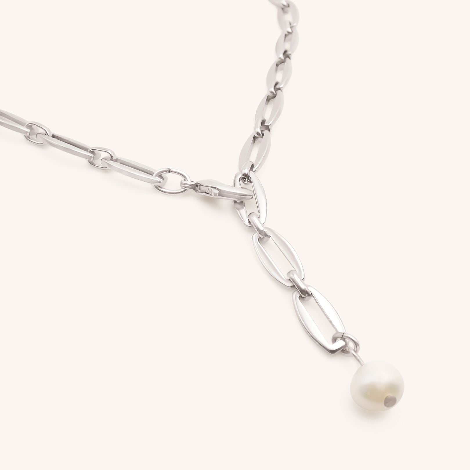 The Long Link Pearl Necklace is both the ultimate statement and staple piece. With a chunky link chain, it features a freshwater pearl charm for a luxe feel. The lobster can be fastened at any point on the necklace, meaning it can be worn any way you choose and to the length you desire. Pair with some pearls for the ultimate stack.